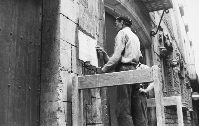 Col·locació de la placa amb el nom del museu a la façana del Palau Berenguer d’Aguilar. c.1963. Fotògraf: Hernández. Museu Picasso, Barcelona | Placa amb el nom del museu a la façana del Palau Berenguer d’Aguilar. c.1963. Museu Picasso, Barcelona