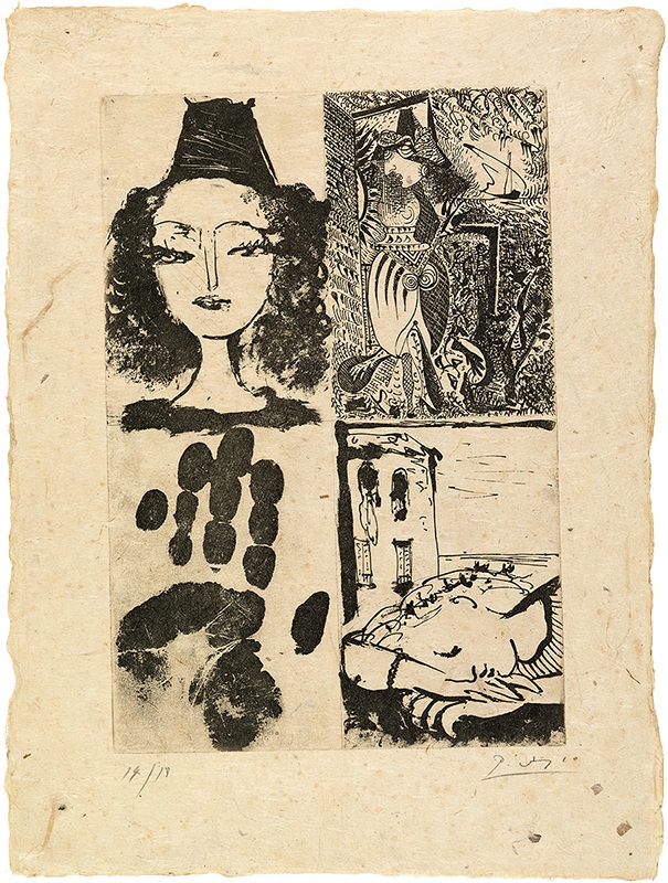 “A principios de junio, mientras se está ocupando de las planchas de Buffon, ejecuta otras tres para ilustrar una edición de 40 ejemplares de La Barre d’appui (poemas de Paul Éluard), impresos en papel Japón antiguo. La fecha de impresión de esta obra es 5 de junio. Picasso ha tomado una plancha de cobre de 215 x 315 mm, la ha dividido en cuatro partes iguales, trazando dos líneas en cruz y se ha puesto a llenar el primer rectángulo con una composición muy complicada. Al lado, esboza el retrato de Nush y en un dos por tres sale del tercero dibujando una cabeza de mujer dormida, en el primer plano, y un paisaje en el fondo. Porque queda un espacio libre en la cuarta parte de la plancha, entinta la palma de su mano y la aplica en el cobre. Antes de cortar la plancha en cuatro partes se tiran 18 ejemplares de esta acuatinta, que reúne las tres ilustraciones y la huella de la mano del autor.”