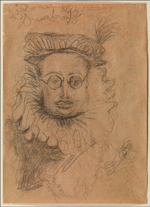 Pablo Picasso. Retrat de Jaume Sabartés amb gorgera i barret . 22/10/1939. Oli sobre tela . 46 x 38 cm. MPB 70.241 | Pablo Picasso. Sabartés, de gentilhome de l'època de Felip II. 25/12/1938. Llapis grafit sobre paper imprès. 28,7 x 20,7 cm. MPB 70.231