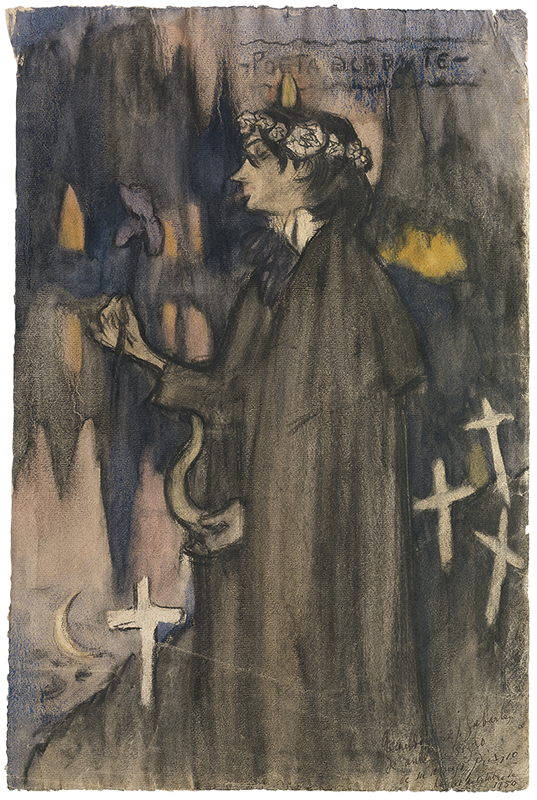 Pablo Picasso. Retrat de Jaume Sabartés, assegut. 1900. Aquarel·la i carbonet sobre paper. 50,5 x 33 cm. MPB 70.228 | Pablo Picasso. Retrat blau de Jaume Sabartés. 1901. Oli sobre tela. 46 x 38 cm. MPB 70.491 | Pablo Picasso. "Poeta decadente". Retrat de Jaume Sabartés. 1900. Carbonet i aquarel·la sobre paper . 48 x 32 cm. MPB 70.232
