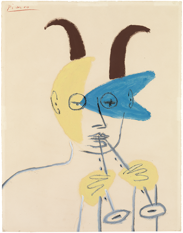 Pablo Picasso. Jaume Sabartés com un faune tocant l'aulos. 14/10/1946. Oli i carbonet sobre paper. 65 x 50 cm. MPB 113.143 | Pablo Picasso. Composició humorística. Retrat de Jaume Sabartés amb Neile Adams. 04/12/1957. Tinta xinesa i llapis gras de color sobre paper imprès de revista retallat. 35,6 x 26 cm. MPB 70.674