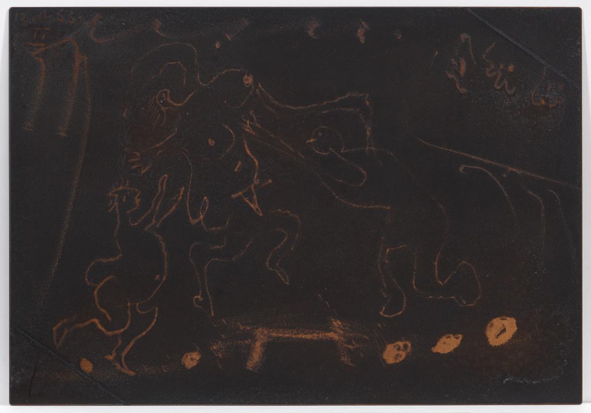 Planxa de coure anul·lada d'aiguatinta (reserves al llapis litogràfic en el granejat)
