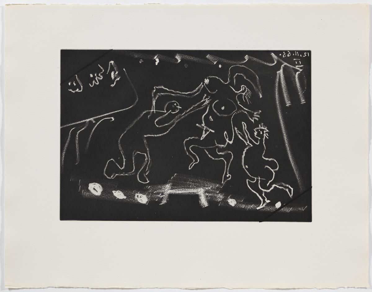 Aiguatinta (reserves al llapis litogràfic en el granejat) sobre coure; estampat sobre paper vitel·la Romaní (prova de planxa anul·lada)