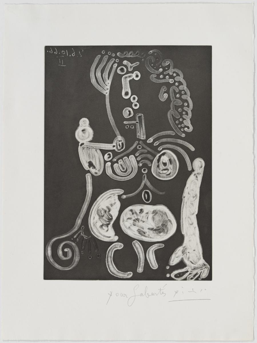 Aiguatinta (planxa uniformement granejada; resina dissolta amb cotó amarat d'alcohol enrotllat sobre un bastonet, fent reserva) sobre coure; estampat sobre paper vitel·la Rives (prova Sabartés)