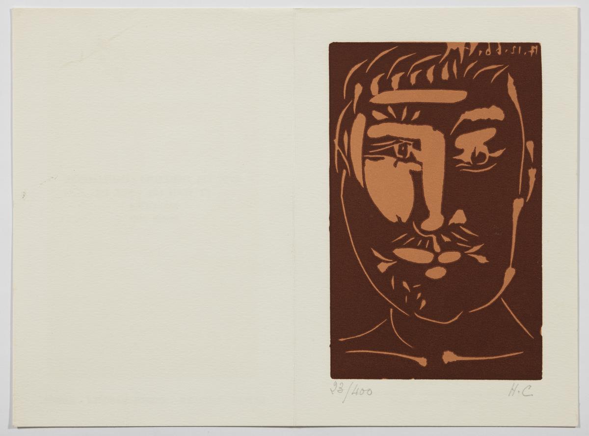 Gravat amb gúbia i navalla sobre linòleum; estampat en dos colors sobre paper vitel·la lleuger (invitació)