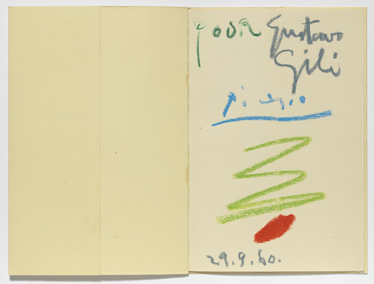 Dedicatòria Dedicatòria 1960 Dedicatòria Autor Pablo Picasso Títol Dedicatòria Lloc d'execució Canes Data 1960 Tècnica Llapis grassos de colors sobre paper Dimensions 22.8 cm x 15.7 cm Número de registre MPB 114.046.1 Necessites una reproducció d'aquesta obra? Tota documentació és per definició un treball en curs. Si tens informació addicional sobre aquest registre o hi detectes cap error, envia'ns els teus comentaris. Obres de La col·lecció relacionades Enllaç cap a obra Trozo de piel Trozo de piel