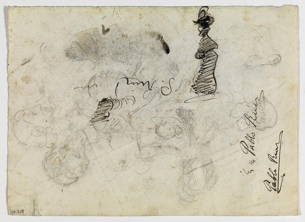 Dona amb barret i maneguí, i altres croquis