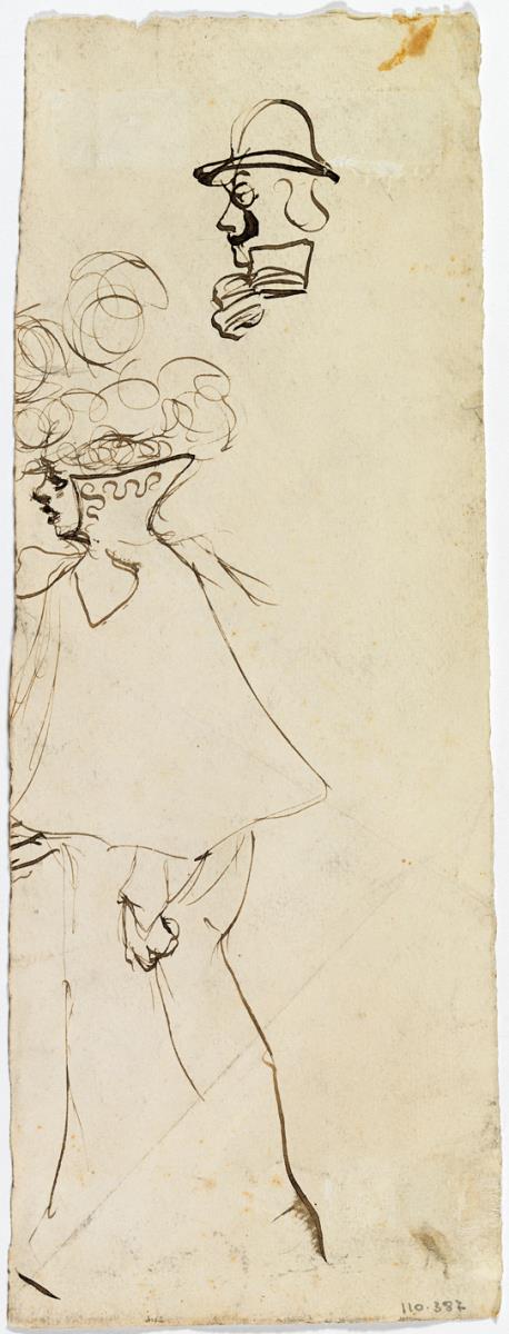 Dona amb vestit llarg, i cap d'home amb barret fort