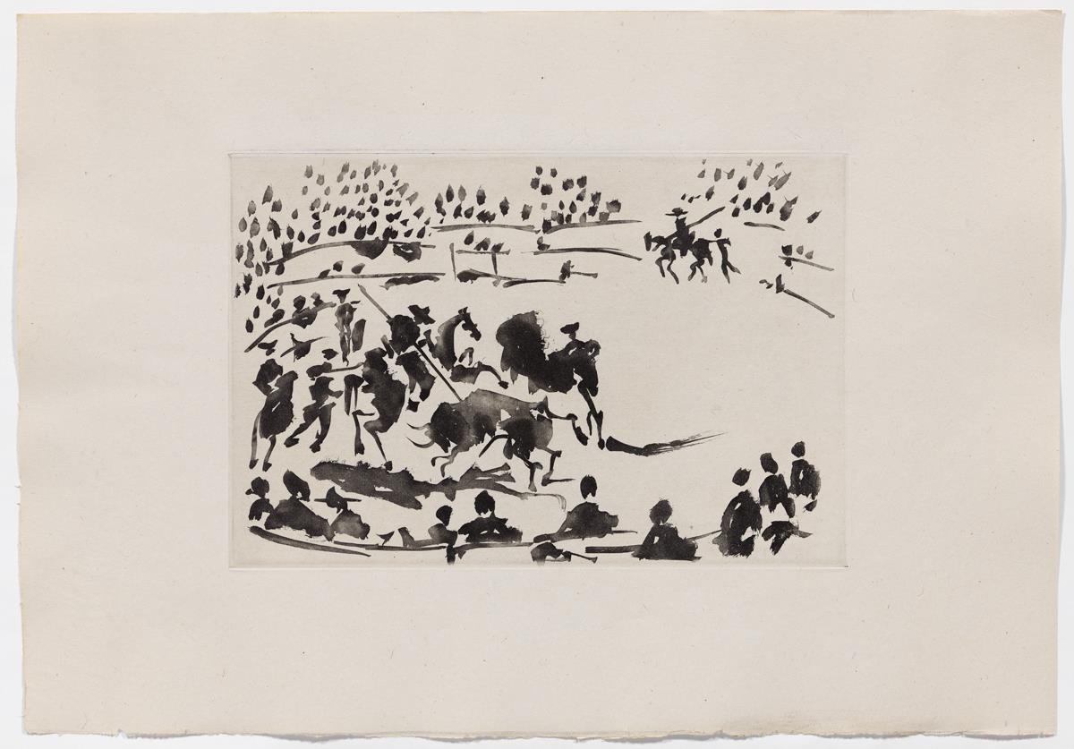 "El picador obligando al toro con su pica"