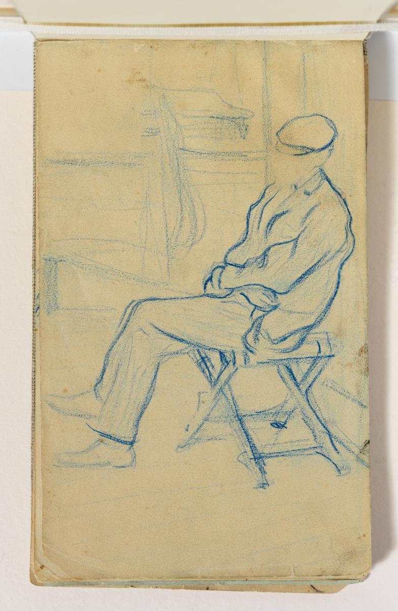 Home assegut en un tamboret Home assegut en un tamboret Home assegut en un tamboret Autor Pablo Picasso Títol Home assegut en un tamboret Lloc d'execució Barcelona Tècnica Llapis blau sobre paper Dimensions 19.2 cm x 11.9 cm Número de registre MPB 111.536 Necessites una reproducció d'aquesta obra? Tota documentació és per definició un treball en curs. Si tens informació addicional sobre aquest registre o hi detectes cap error, envia'ns els teus comentaris. Col·leccions Dibuix Obres de La col·lecció relacionades Enllaç cap a obra Home assegut en un banc Home assegut en un banc Enllaç cap a obra Àlbum de Barcelona, 1899 Àlbum de Barcelona, 1899