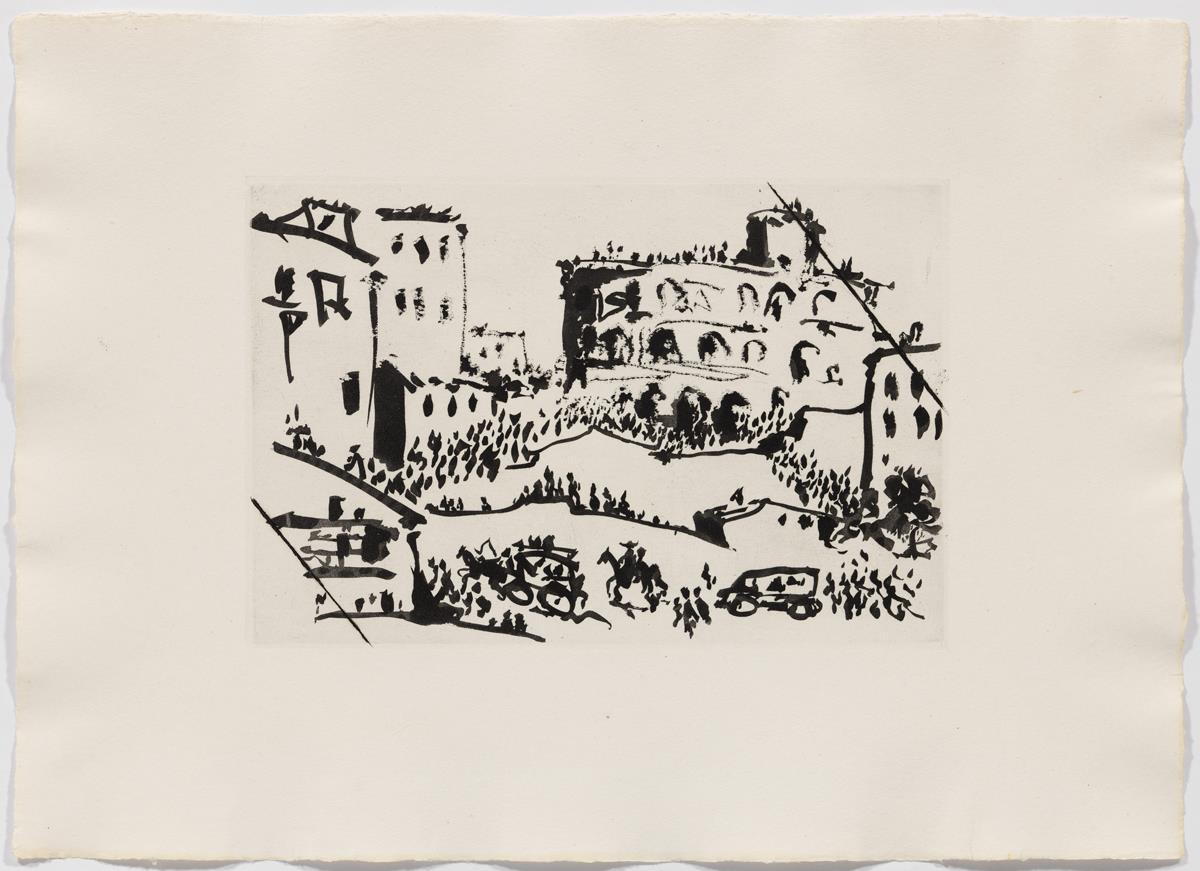 Aiguatinta al sucre amb mossegada a la mà sobre coure; estampat sobre paper vitel·la pur fil Guarro (prova de planxa anul·lada)