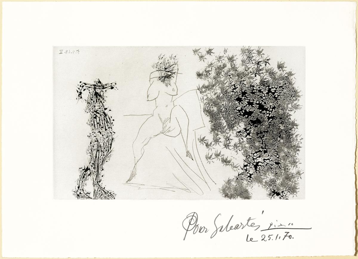 Aiguatinta al sucre i raspador sobre coure greixat; estampat sobre paper vitel·la Rives (prova Sabartés)