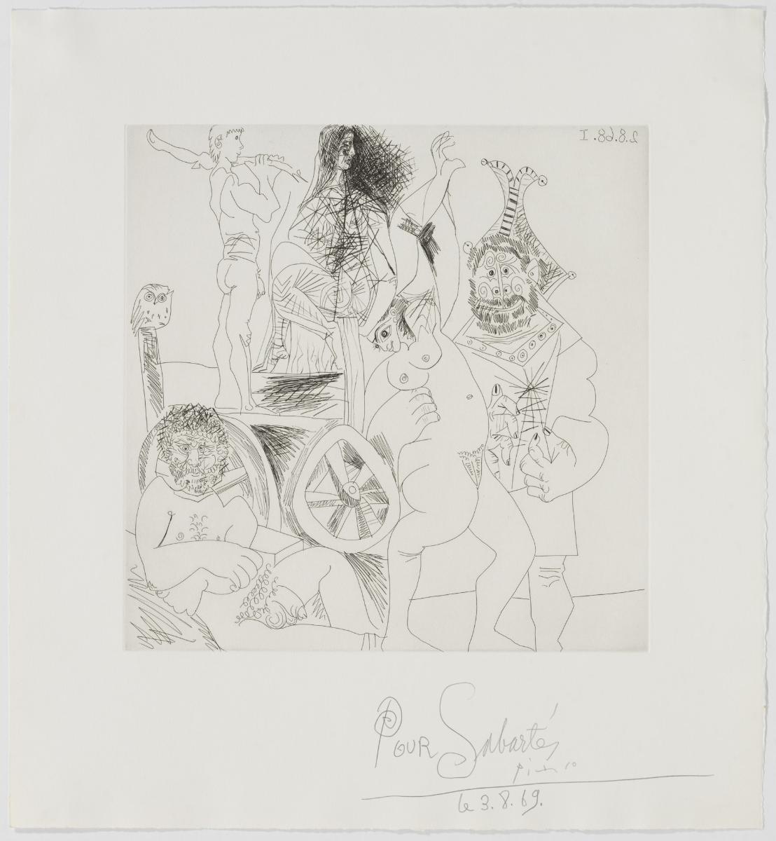 Aiguafort i punta seca sobre coure; estampat sobre paper vitel·la Rives (prova Sabartés, II estat i definitiu)