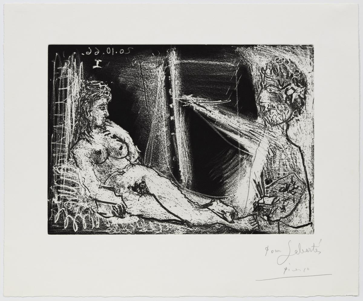Aiguatinta (reserves al llapis litogràfic en el granejat) i aiguafort sobre coure; estampat sobre paper vitel·la Rives (prova Sabartés)