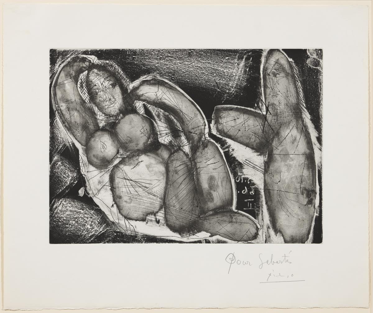 Aiguatinta (reserves al vernís líquid i al llapis litogràfic en el granejat) i aiguafort sobre coure; estampat sobre paper vitel·la Rives (prova Sabartés)