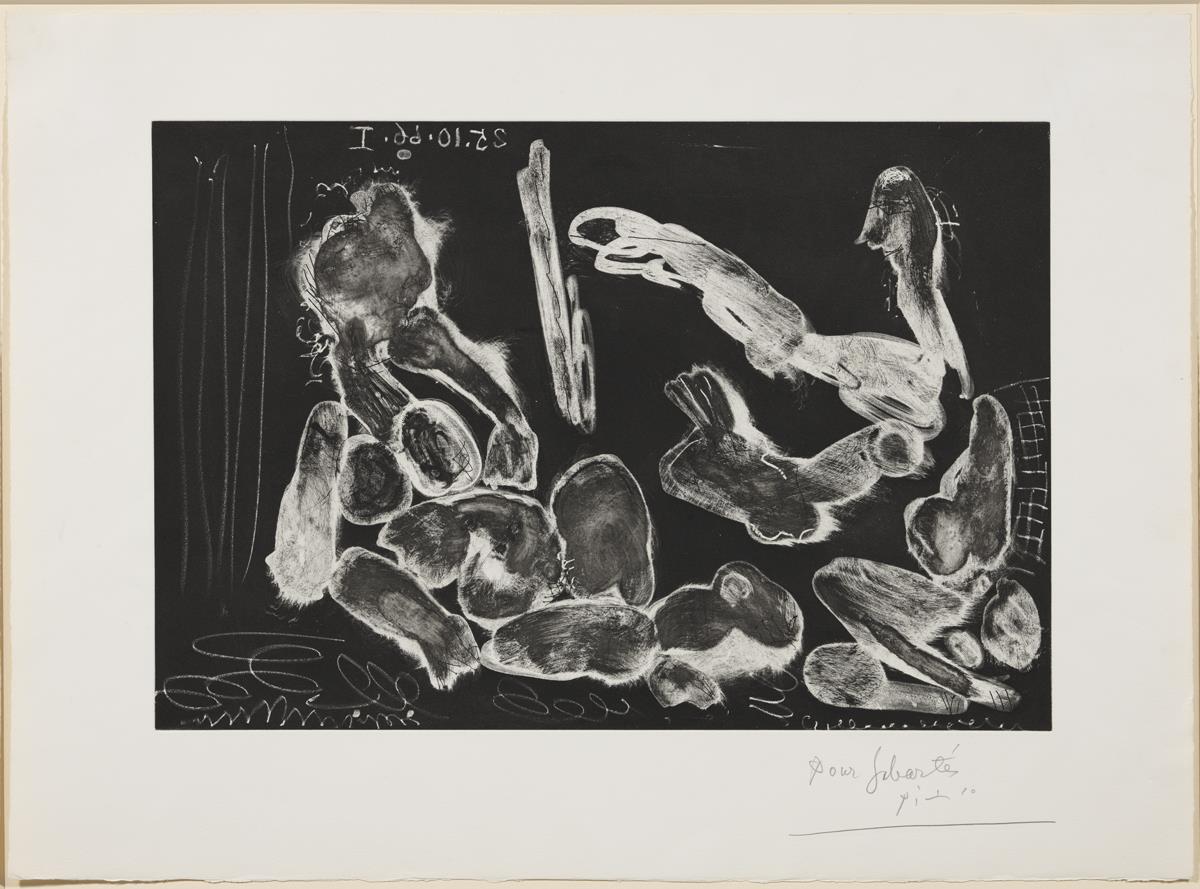 Aiguatinta (reserves al vernís líquid i al llapis litogràfic en el granejat) i aiguafort sobre coure; estampat sobre paper vitel·la Rives (prova Sabartés)