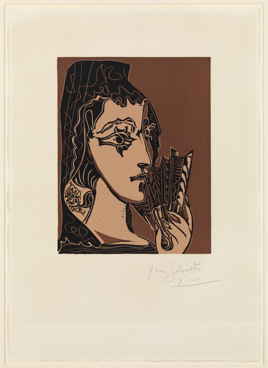 Gravat amb gúbia i navalla sobre linòleum; estampat en tres colors sobre paper vitel·la Arches (prova Sabartés, IV estat i definitiu)