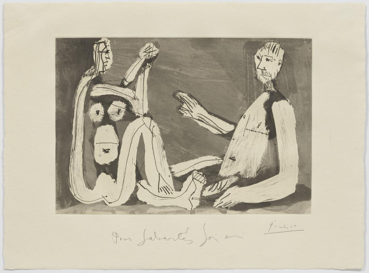 Aquatint (selected areas treated with stop-out varnish and mordant applied by brush on grained plate), etching (in some parts the needle acts directly on the plate producing the effect of a drypoint) and drypoint (date) on copper; printed on Richard de Bas vellum paper (Sabartés proof)