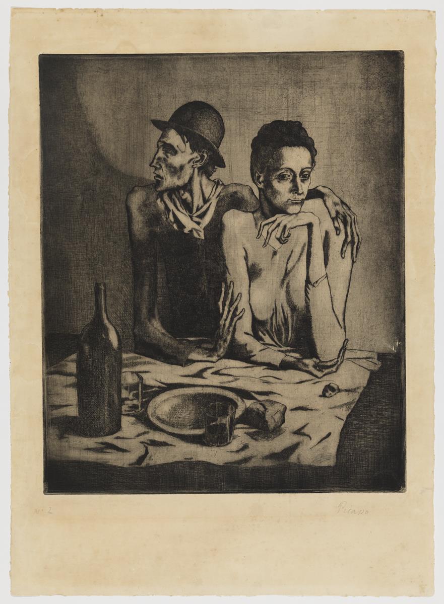 On 3 September 1904, Picasso etched “The Frugal Meal” on a zinc plate on which Joan González, brother of sculptor Juli González, had previously begun to etch a landscape. Created in two states, this final etching eventually saw the light of day in Picasso’s studio at the Bateau-Lavoir, on Rue Ravignan in the Montmartre district of Paris, where he settled following his definitive departure from Barcelona in April 1904. In that same building lived Ricard Canals, an artist from Barcelona with whom Picasso had a close friendship at the time and who mentored him in his new artistic endeavour to master the etching technique.