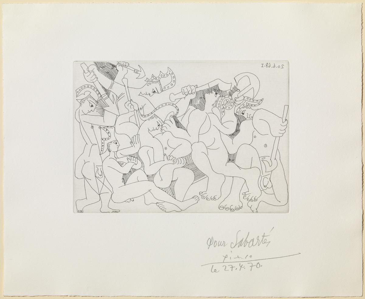 Gladiator Fight Gladiator Fight Gladiator Fight Author Pablo Picasso Título Gladiator Fight Execution place Mougins Medium Etching on copper; printed on Rives vellum paper (Sabartés proof) Dimensions 14.8 cm x 20.9 cm Acquisition data Gift of Pablo Picasso, 1971 Inventory number MPB 111.860 ¿Necesitas una reproducción de esta obra? The entire documentation process is, by definition, a work in progress. If you have additional information on this register or spot any errors, please send us your comments. Collections Graphic artwork