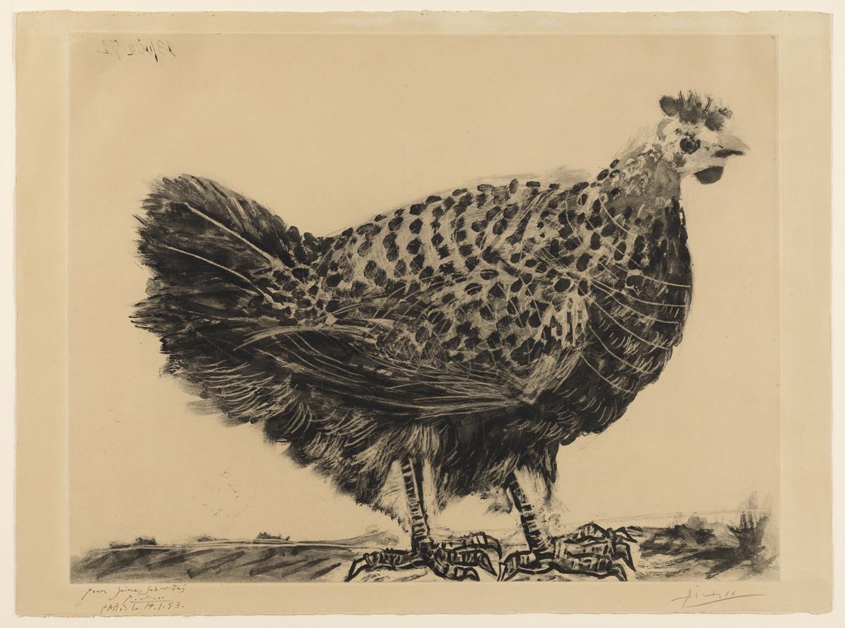 The Hen The Hen The Hen Author Pablo Picasso Título The Hen Execution place Paris Medium Aquatint, drypoint (date) and scraper on copper; printed on Arches vellum paper (Sabartés proof, VI and final state) Dimensions 52 cm x 66.5 cm Acquisition data Gift of Jaume Sabartés, 1962 Inventory number MPB 70.254 ¿Necesitas una reproducción de esta obra? The entire documentation process is, by definition, a work in progress. If you have additional information on this register or spot any errors, please send us your comments. Collections Graphic artwork