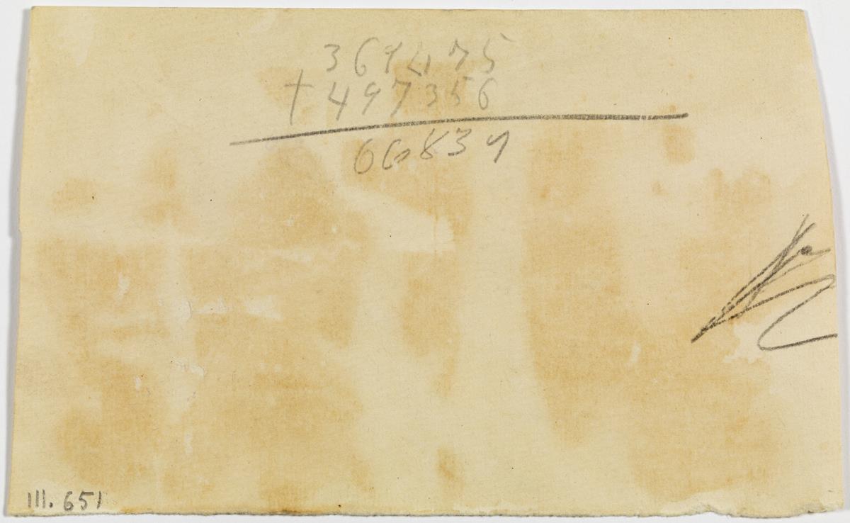 Mathematical Calculations Mathematical Calculations 1900 Mathematical Calculations Author Pablo Picasso Título Mathematical Calculations Execution place unknown Date 1900 Medium Graphite pencil on paper Dimensions 9.3 cm x 15.3 cm Acquisition data Gift of Pablo Picasso, 1970 Inventory number MPB 111.651R ¿Necesitas una reproducción de esta obra? The entire documentation process is, by definition, a work in progress. If you have additional information on this register or spot any errors, please send us your comments.