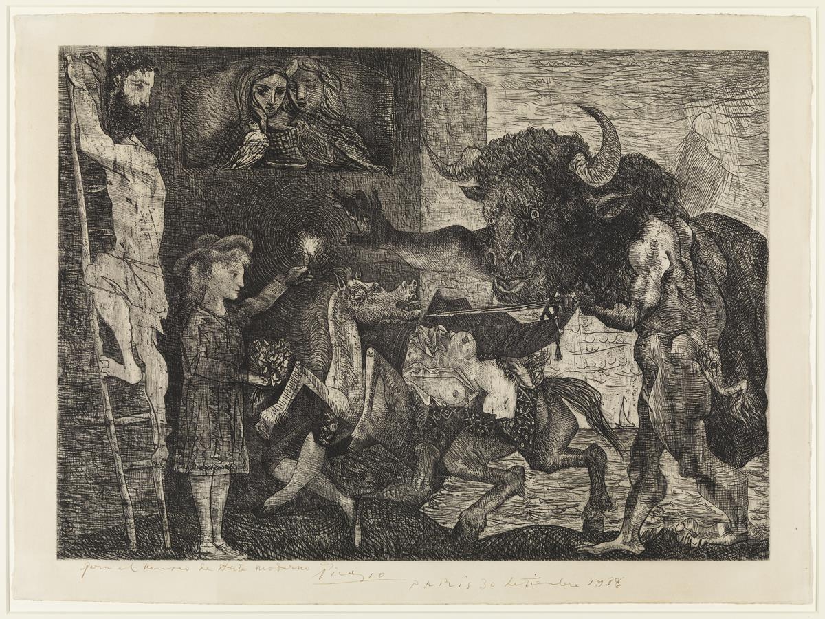 This print of “Minotauromachy”, complete with a dedication and printed by Roger Lacourière in Paris on laid Montval paper, of the etching’s seventh and final state, was donated by Picasso to Museus d’Art de Barcelona in 1938, in the midst of the Spanish Civil War. In 1963, following the creation of the Museu Picasso in Barcelona, the print became part of its collection, seeing as all municipally owned works by the artist were transferred to the newly created museum.