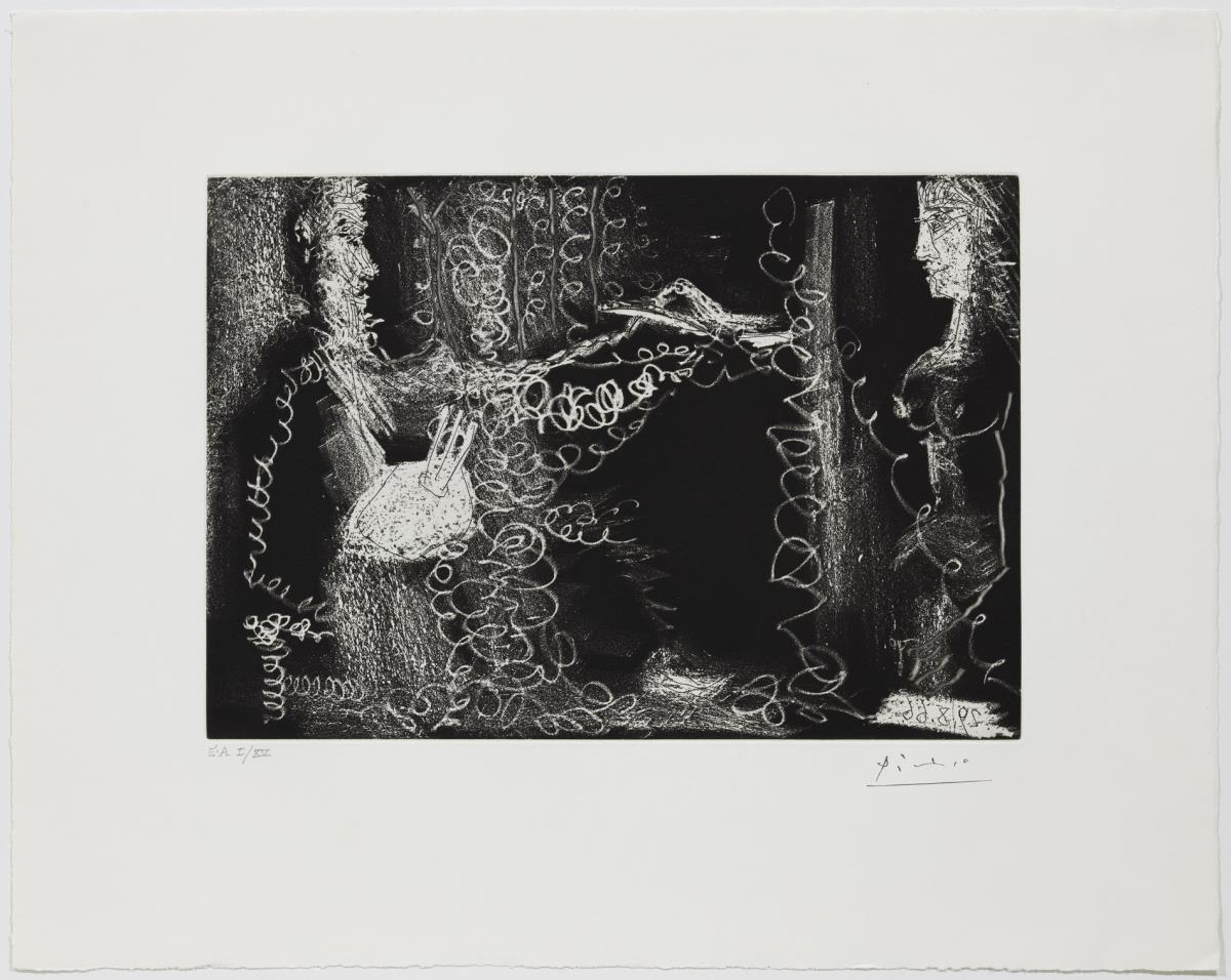 Aquatint (selected areas treated with stop-out lithographic crayon on grained plate) and etching (in some parts the needle acts directly on the plate producing the effect of a drypoint) on copper; printed on Rives vellum paper (numbered artist's proof)