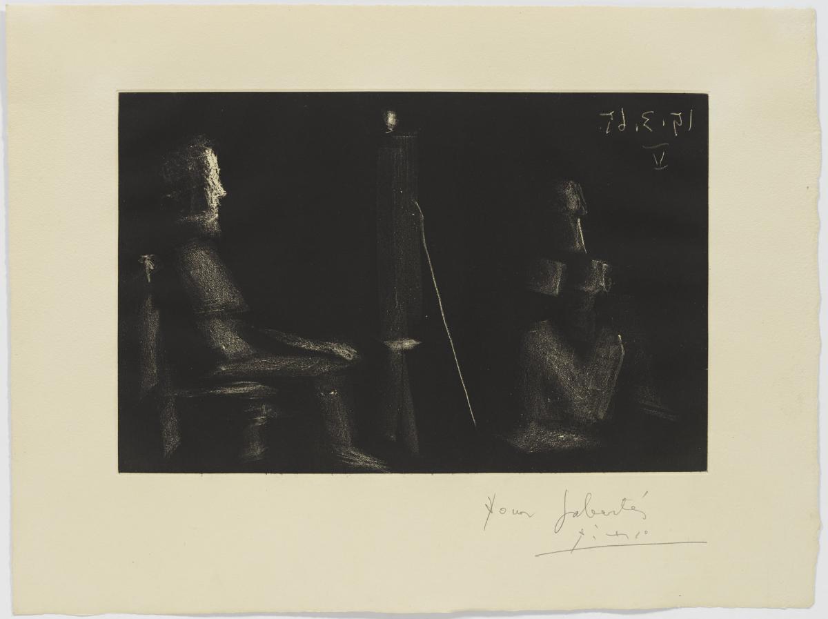 Aquatint (selected areas treated with stop-out lithographic crayon on grained plate) on copper; printed on Richard de Bas vellum paper (Sabartés proof)