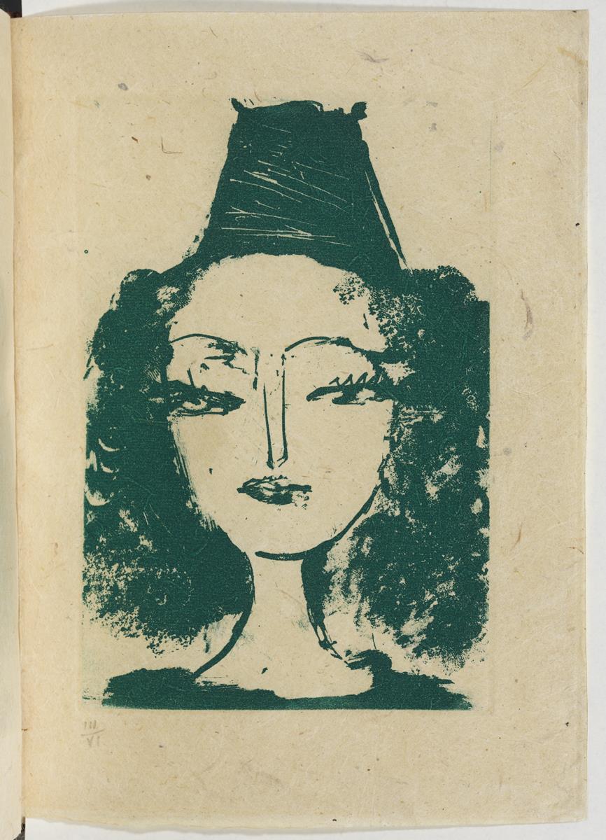 Sugar-lift aquatint and drypoint (on the cheek) on copper; printed in green ink on Manufactures Impériales Japanese ancient paper (II and final state)