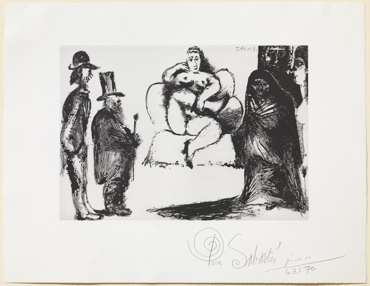 Sugar-lift aquatint and scraper on greased copper; printed on Rives vellum paper (Sabartés proof)