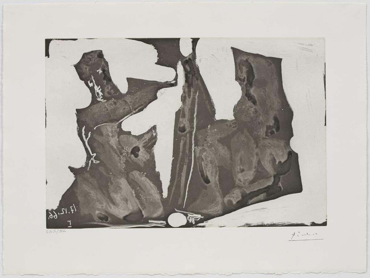 Aquatint (selected areas treated with stop-out liquid varnish and lithographic crayon on grained plate) and etching on copper; printed on Rives vellum paper (numbered artist's proof)