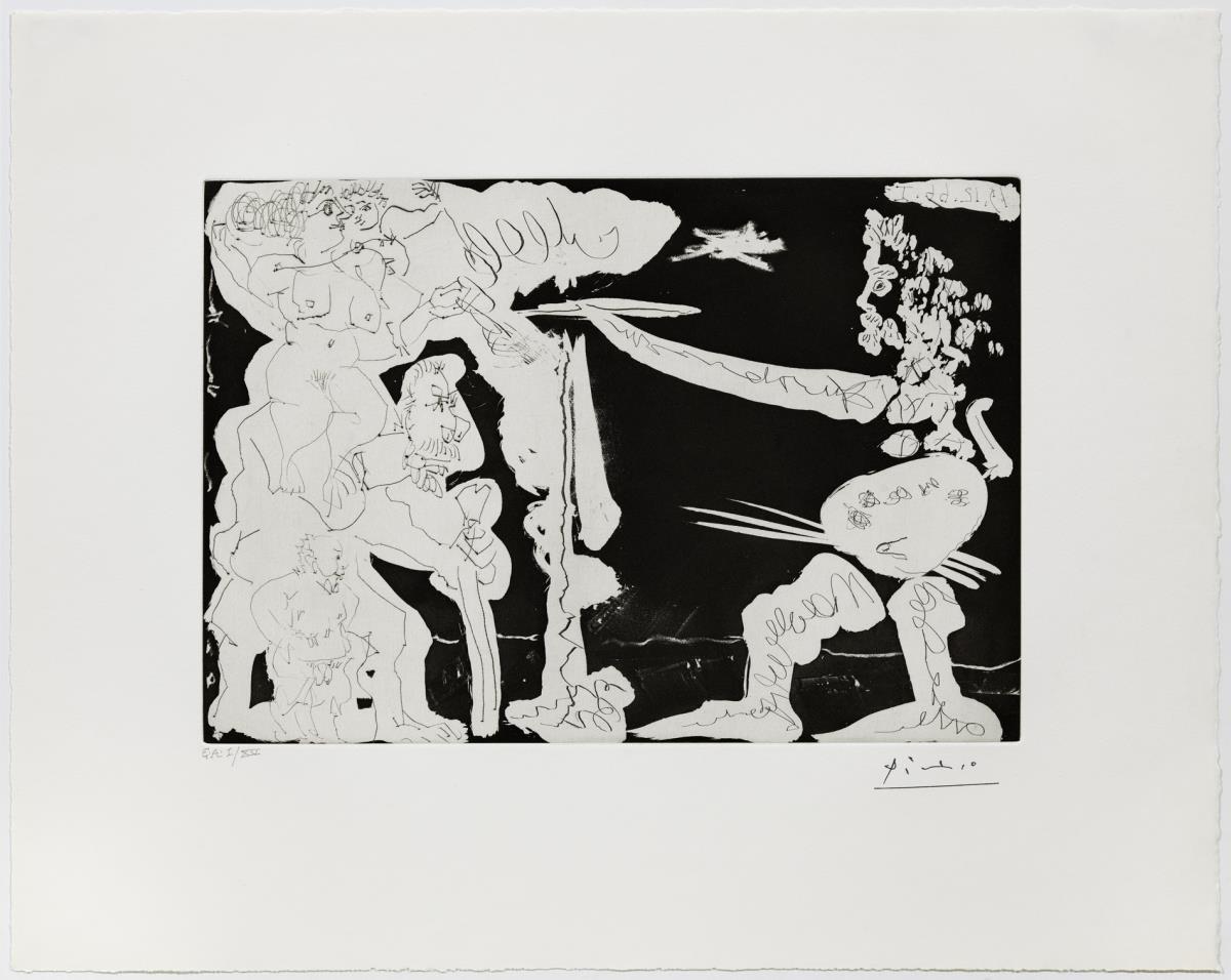 Aquatint (selected areas treated with stop-out liquid varnish and lithographic crayon on grained plate), etching and dry point on copper; printed on Rives vellum paper (numbered artist's proof)