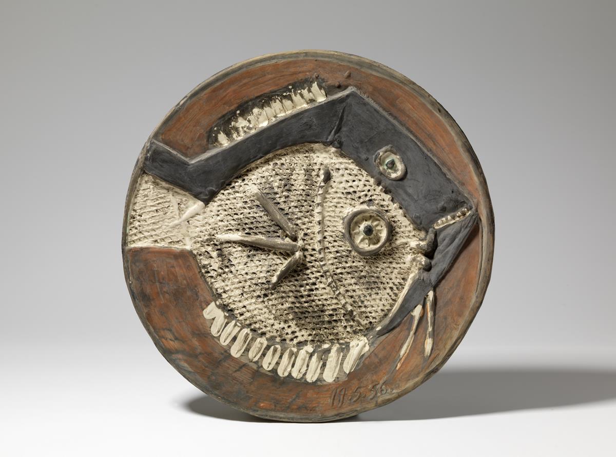 "Empreinte originale": white earthenware, decorated with slips and white glaze, dark patina. Verso: decorated with oxide and grey patina