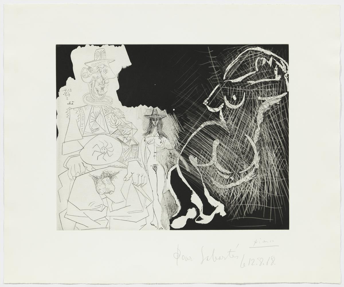 Aquatint, drypoint and scraper on copper; printed on Rives vellum paper (Sabartés proof, II and final state)