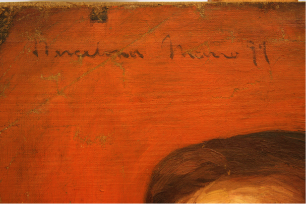 The careful observation of this documentation reveals that the canvases were fragments that were not mounted on supporting frames. The marks of the drawing pins could be seen on the upper edge that indicate the way in which it was attached to a rigid support during the execution of the paintings. The folds and losses of material bear witness to the vicissitudes of these two canvases preserved in the family home over the years, until the donation. The remnants of paint on this same edge highlight the traces of a clip that completed the fastening in the moment of being painted. Could this small remnant indicate that initially the background was dark, as in the full face portrait produced with little time difference?