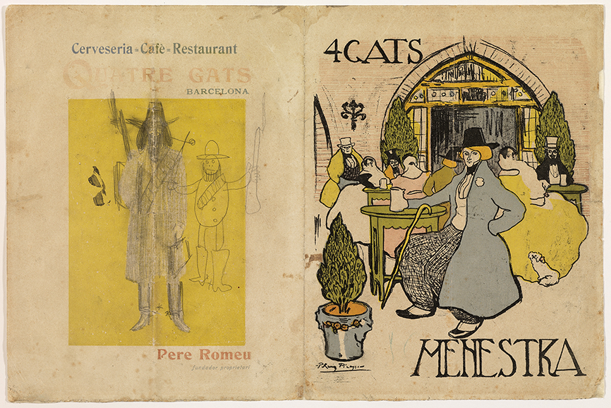 Pablo Picasso. Pere Romeu caricaturizado de bóer, y otros croquis (menú de Quatre Gats). Barcelona, 1899-1900. Lápiz grafito sobre papel impreso. Donación Picasso, Pablo, 1970. Museu Picasso, Barcelona. MPB 110.813