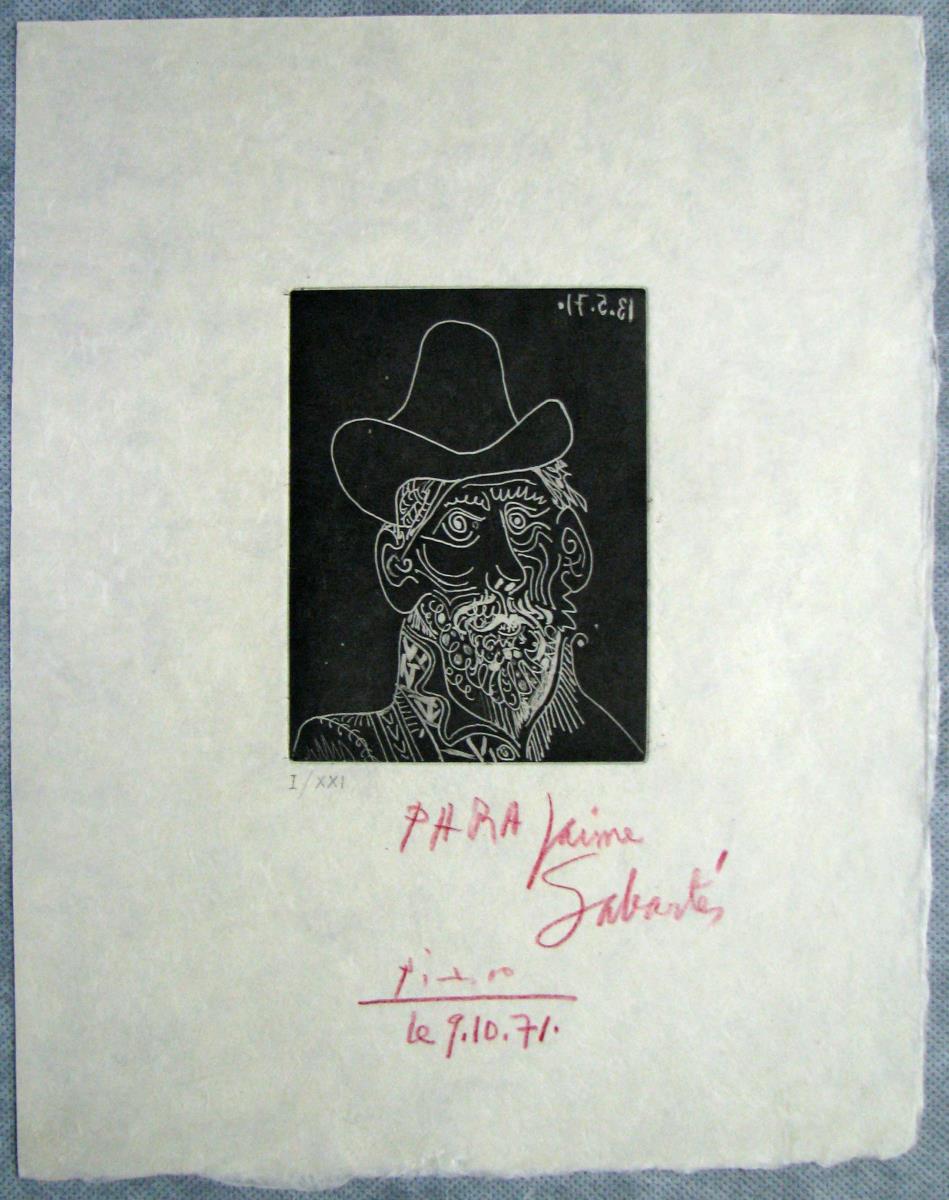 Aguatinta (reservas al "rotring con barniz" sobre el graneado) sobre cobre; estampado sobre papel japón anacarado (prueba Sabartés y prueba de artista numerada)