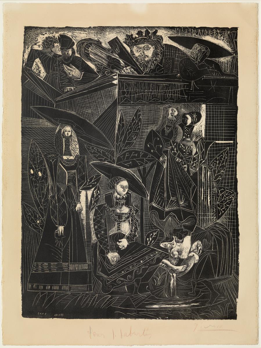 Litografía. Pluma y rascador sobre plancha de zinc transferida sobre piedra; estampado sobre papel vitela Arches (prueba Sabartés, VI estado)