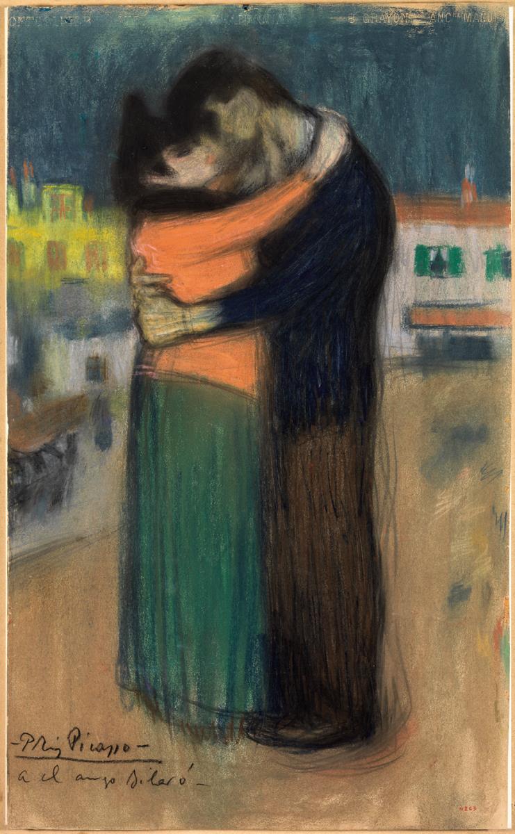 El empleo de la técnica del pastel, que Picasso ya había utilizado, experimenta un incremento en este período, sin duda motivado por la influencia de la obra de virtuosos como Toulouse-Lautrec o Degas. La pareja protagonista de este pastel se resuelve mediante trazos violentos aplicados en paralelo y un cromatismo vibrante ligado posiblemente a la representación de una escena nocturna. La composición presenta una verticalidad poco habitual en obras coetáneas de Picasso. El tema remite a la iconografía de artistas como Steinlen o Munch, y más remotamente a Rodin. Escenas de parejas abrazándose en espacios públicos y con referencias al mundo obrero podían encontrarse, por ejemplo, en ilustraciones de Steinlen para la revista Gil Blas, que a su vez evocan la literatura naturalista de la época. Picasso trató el mismo tema también en obras realizadas con otras técnicas como el lápiz, el carboncillo o el óleo. Esta temática tiene algún precedente en diversos dibujos barceloneses del período 1899-1900, que forman parte de la colección del museo, y posteriormente se consolidaría en París con óleos coetáneos de escenas de interior y exterior. Entre las primeras se pueden citar las pinturas que, con el mismo título, "El abrazo", se conservan en el Museo Pushkin de Moscú y en la Galerie Beyeler de Basilea; de las segundas, cabe destacar el óleo también homónimo que, perteneciente a una colección particular, recrea la misma composición y los mismos personajes que este pastel.