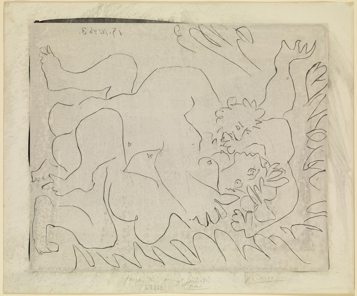 Grabado con gúbia fina o navaja sobre linóleo; estampado en blanco crema, entintado y aclarado, sobre papel vitela Arches (prueba Sabartés)