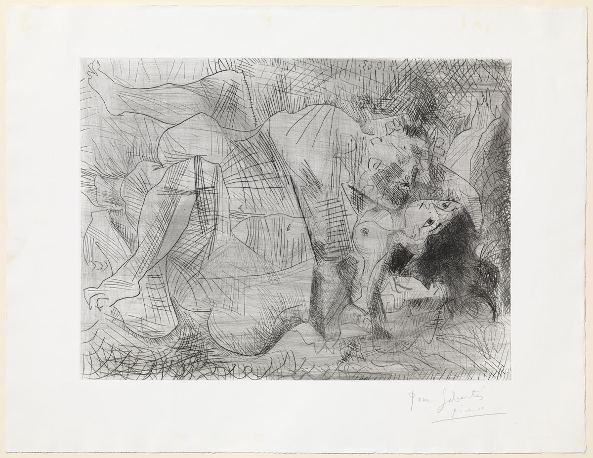 Aguafuerte, punta seca, rascador, buril y papel de lija sobre cobre; estampado sobre papel vitela Rives (prueba Sabartés, V estado y definitivo)