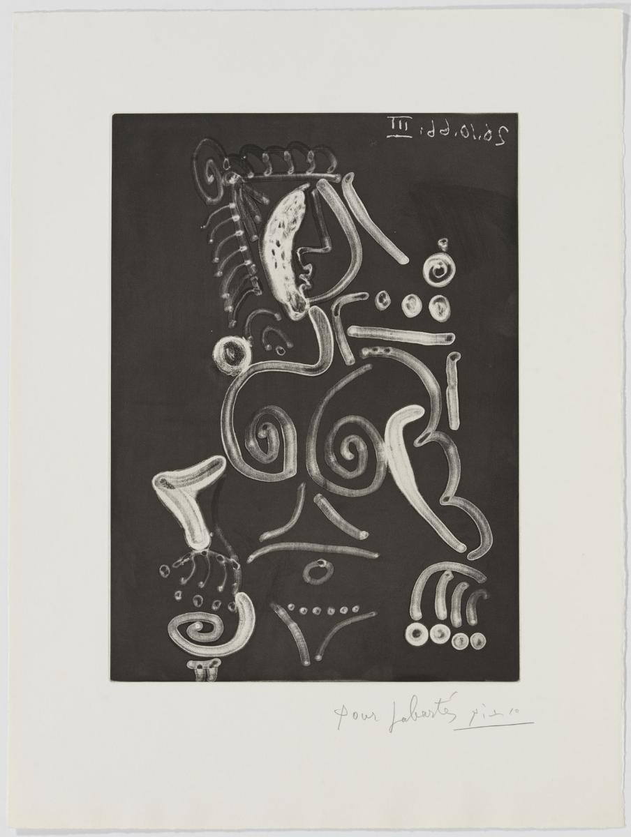 Aguatinta (plancha uniformemente graneada; resina disuelta con algodón empapado de alcohol enrollado sobre un bastoncito, haciendo reserva) sobre cobre; estampado sobre papel vitela Rives (prueba Sabartés)