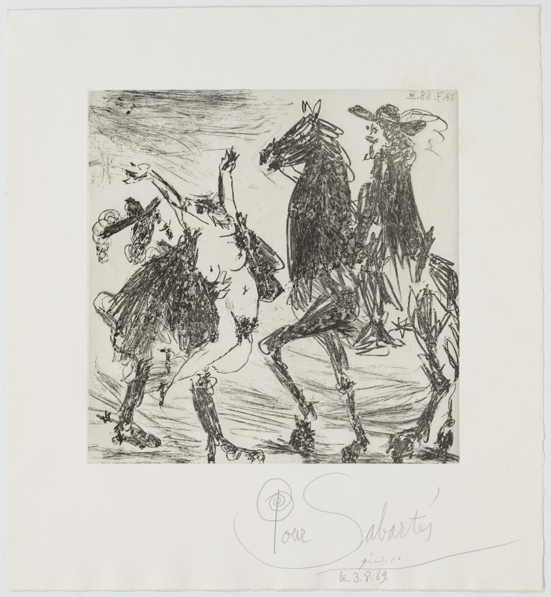 Rapto. II Rapto. II Rapto. II Autor Pablo Picasso Título Rapto. II Lugar de ejecución Mougins Técnica Aguafuerte (con cuchillo) sobre cobre; estampado sobre papel vitela Rives (prueba Sabartés) Dimensiones 31.5 cm x 31.5 cm Datos de ingreso Donación Pablo Picasso, 1970 Número de registro MPB 70.630 ¿Necesitas una reproducción de esta obra? Todo proceso de documentación es, por definición, un trabajo en desarrollo. Si tienes información adicional sobre este registro o detectas algún error, envíanos tus comentarios, por favor. Colecciones Obra gráfica Exposiciones 1970- "Donación Grabados de Picasso". Museu Picasso, Barcelona, Barcelona (Espanya)