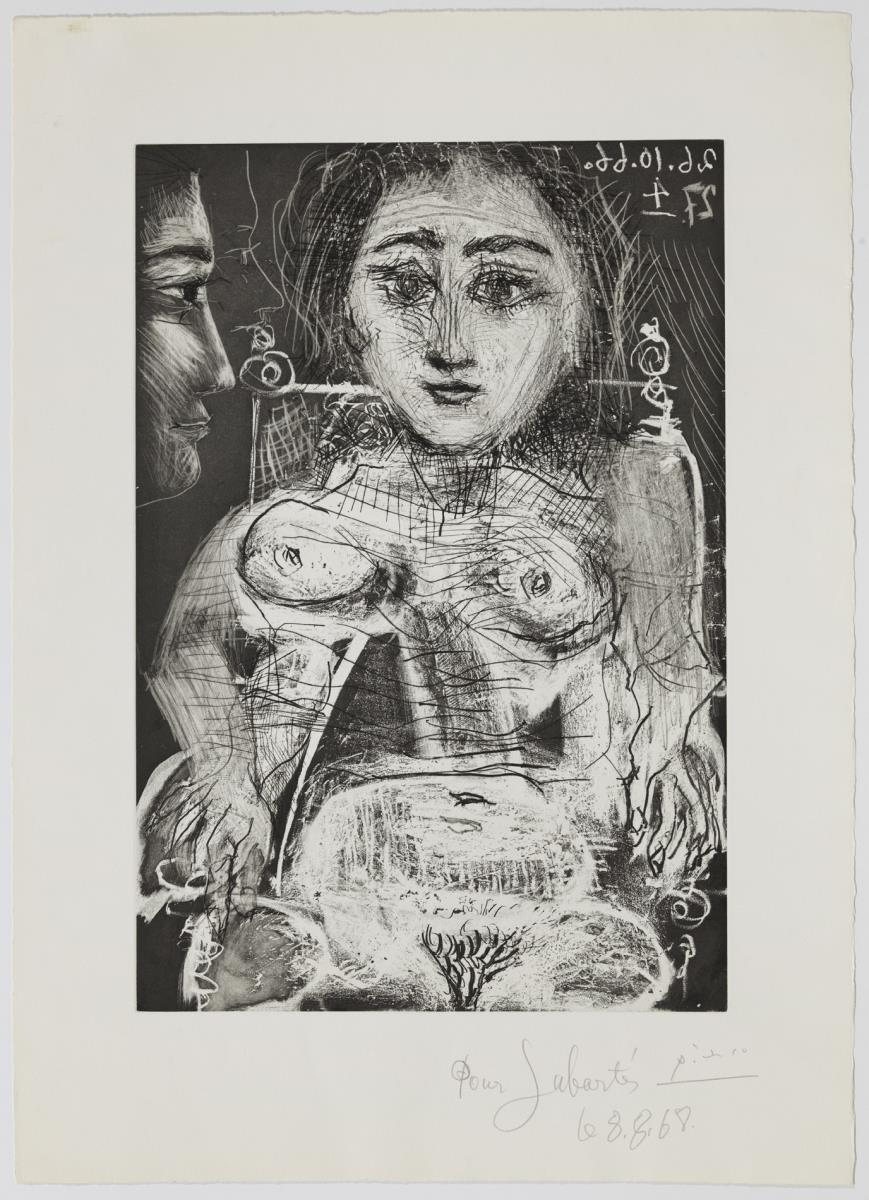 Aguatinta, aguafuerte, punta seca y rascador sobre cobre; estampado sobre papel vitela Rives (prueba Sabartés, II estado y definitivo)