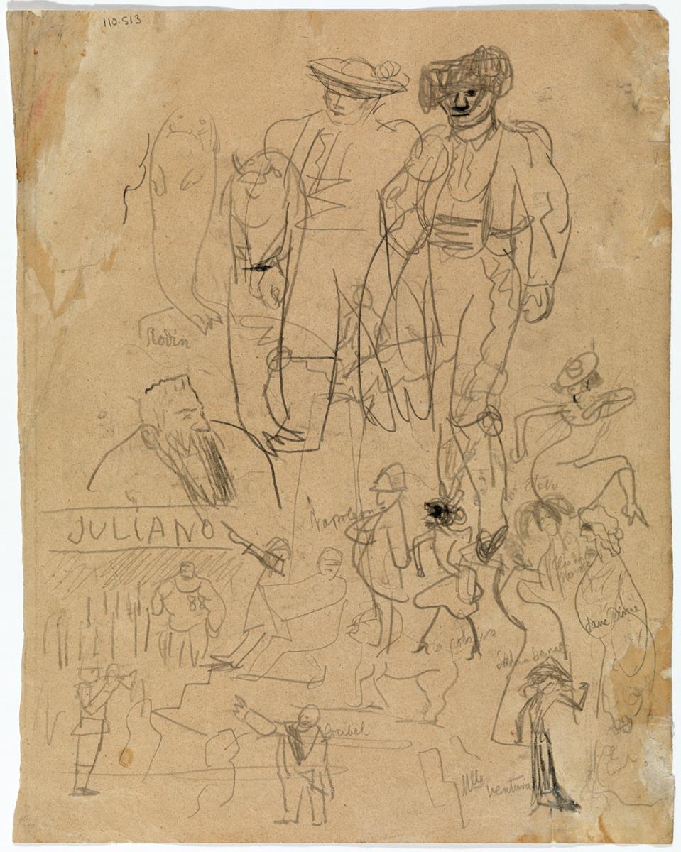 Torero y picador, busto de Rodin, copia de la escultura "Un paso adelante" de Hans Lerche, y caricaturas diversas