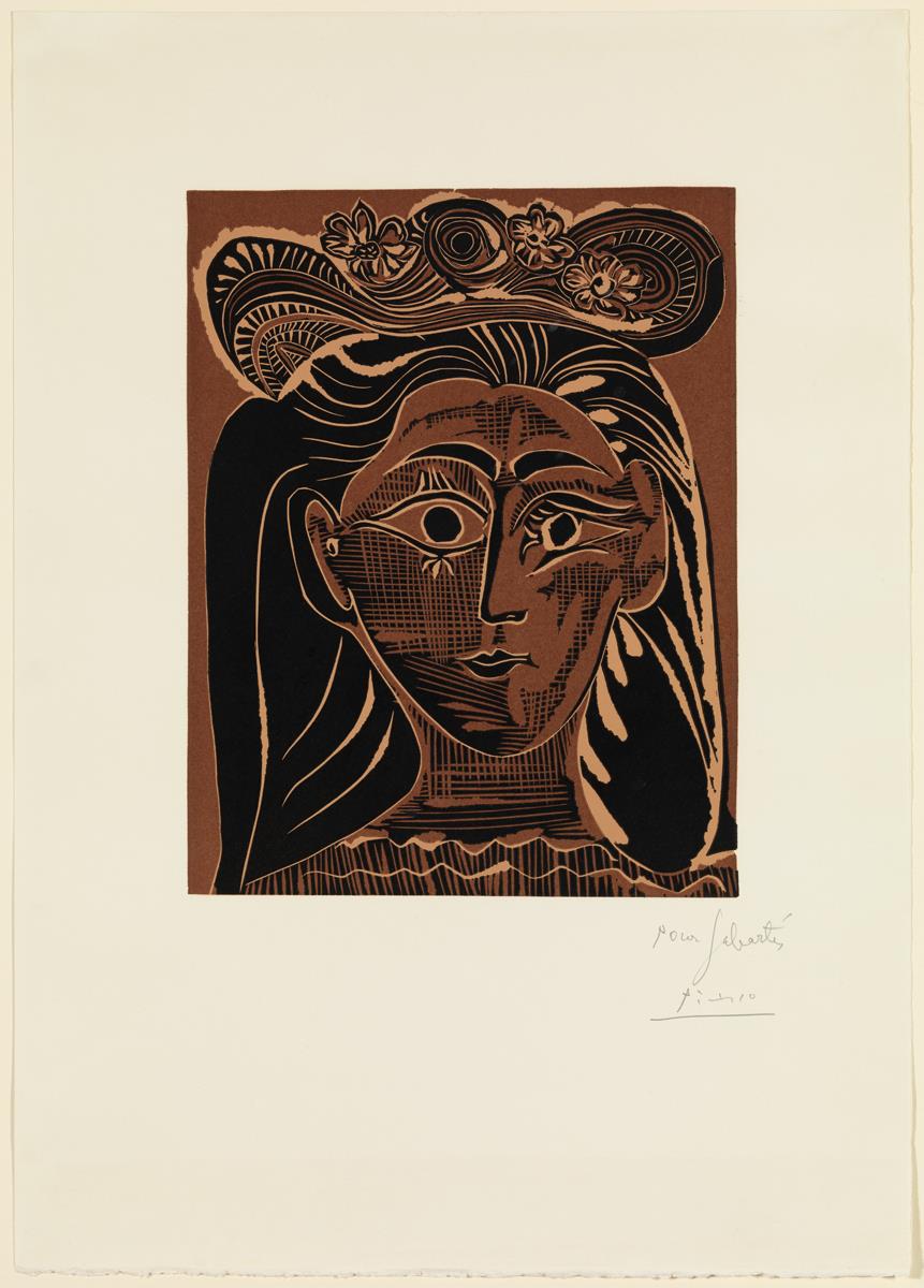 Grabado con gubia y navaja sobre linóleo; estampado en tres colores sobre papel vitela Arches (prueba Sabartés, II estado y definitivo)