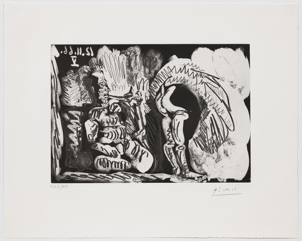 Aguatinta (reservas al barniz líquido en el graneado), aguafuerte, punta y rascador sobre cobre; estampado sobre papel vitela Rives (prueba de artista numerada)
