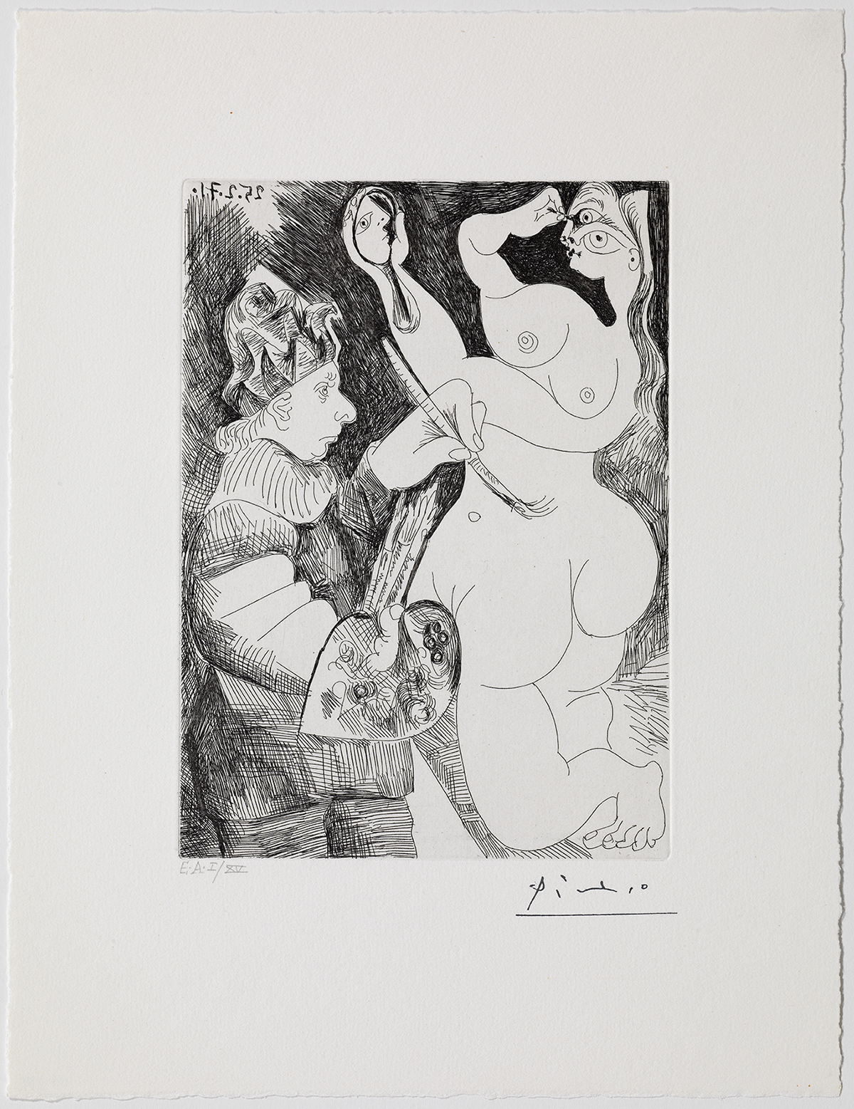 Pablo Picasso. Pintor-bufó pintant sobre la seva model. Suite 156, planxa 58. Mougins, 25 de febrer del 1971. Aiguafort sobre coure, estampat sobre paper vitel·la Rives . Museu Picasso, Barcelona. Donació Hereus de Pablo Picasso, 1979. MPB 112.308. Museu Picasso, Barcelona. Fotografia: Gasull Fotografia
