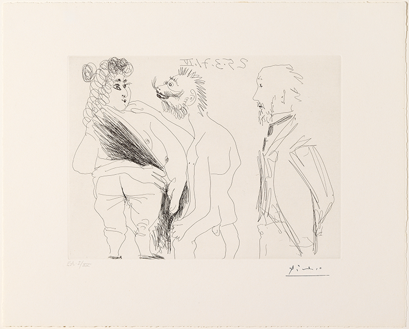 Pablo Picasso. Escena de seducció entre un depravat i una prostituta, amb Degas espiant. Planxa 95. Mougins, 25 de març del 1971 (IV). Aiguafort sobre planxa de coure, estampat sobre paper vitel·la Rives (prova d'artista numerada). 36,3 x 45,1 cm (làmina); 22,7 x 30,5 cm (planxa). Museu Picasso, Barcelona. Donació Hereus de Pablo Picasso, 1979. MPB 112.274. Museu Picasso, Barcelona. Fotografia: Gasull Fotografia